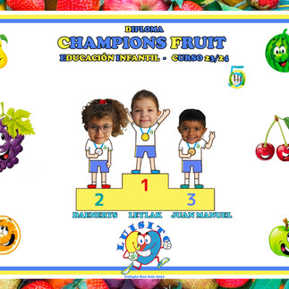 Champions Fruit es una actividad dentro del programa de SALUD del colegio y los "champions fruit" son los devoradores de fruta de nuestro cole. En cada curso, el tutor lleva la cuenta de cuanta fruta come cada alumno a lo largo del año, al finalizar se hace recuento y los campeones se llevan su diploma personalizado.